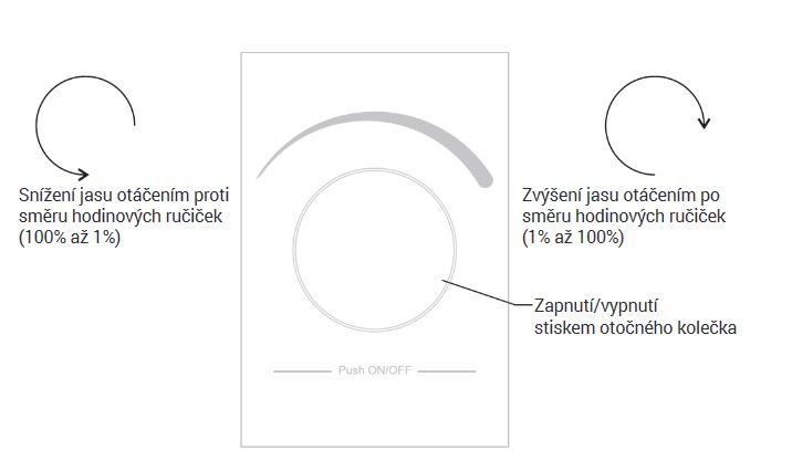 - Ovládání otočným knoflíkem - stisk = on/off, otočení = stmívání/zesilování osvětlení