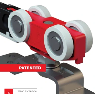 Kolečka posuvného vozíku jsou vybavena potaženými ložisky velkých rozměrů a patentovanými setrvačnými tlumiči umístěné bočně. Tyto tlumiče. Vložené mezi ložiska a pevnou podpěru, umožňují kolečkům vždy rovnoměrně dosedat na profil posuvu a to i v případě nerovnosti nosné stěny, nebo nepřesné montáže pos.profilu.