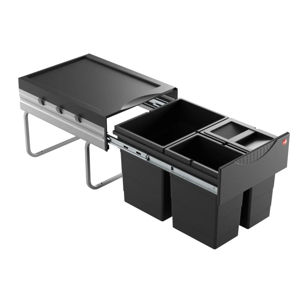 Vestavný odpadkový koš Raumspar Tandem: úspěšný systém třídění odpadků do skříněk se zavěšenými dveřmi (montáž je možná levo- i pravostranná). Vestavný odpadkový koš určený pro montáž do skříňky od šířky 400 mm.